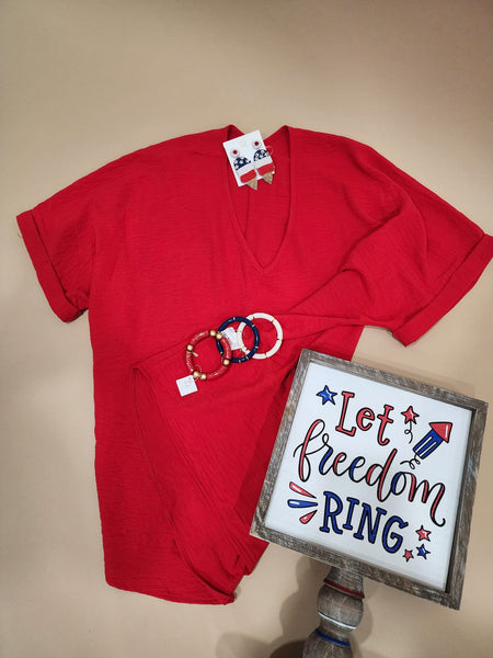 Wear this adorable top in all your weekends out! This top includes a v neckline with a stitched placket, short drop sleeves, and a flowy body.