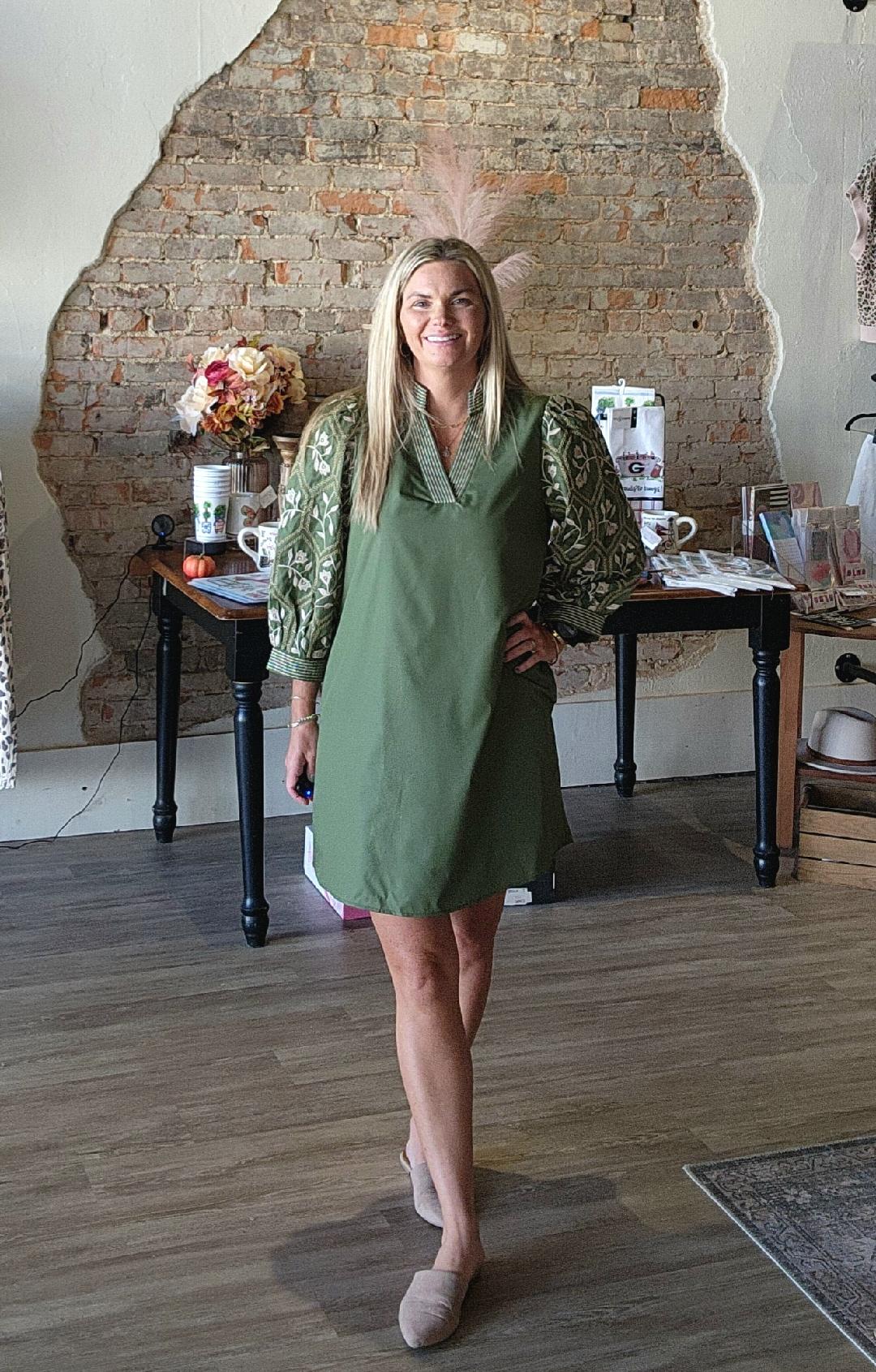 Step into autumn with effortless charm in our Olive Grove Dress. Featuring a rich olive green hue and beautifully embroidered sleeves, this dress blends cozy sophistication with seasonal flair. The relaxed fit and flattering neckline make it perfect for pairing with boots or tights for all your fall outings—from pumpkin patches to dinner dates.