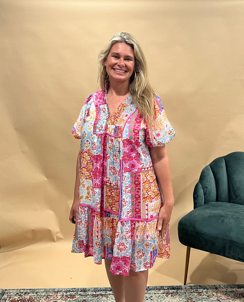 A Pink Patch Mix Dress is a playful, eclectic piece that combines vibrant pink hues with a variety of fabric patches, giving it a unique, artsy vibe. The mix of textures and colors—whether it's floral, solid, or abstract—creates an eye-catching and fun design. Its cut could range from a relaxed fit to something more tailored, but the focus is always on the cheerful and creative patchwork design. Perfect for a casual day out, a creative event, or a laid-back party, this dress is all about fun, individuality, and bold style.