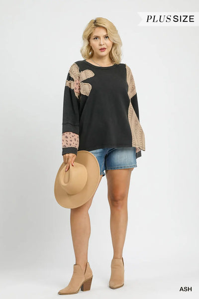 Meet your new go-to casual piece — the Desert Bloom Patchwork Top! This plus-size beauty features a relaxed, oversized fit with a mix of floral and paisley patchwork accents that add a soft, feminine touch to the washed black body. The lightweight knit fabric keeps it comfy, while the drop shoulders and raw edge details give it that perfectly effortless, boho vibe. Pair it with denim shorts and ankle boots for an easy, laid-back look or dress it up with jeans for fall outings.
