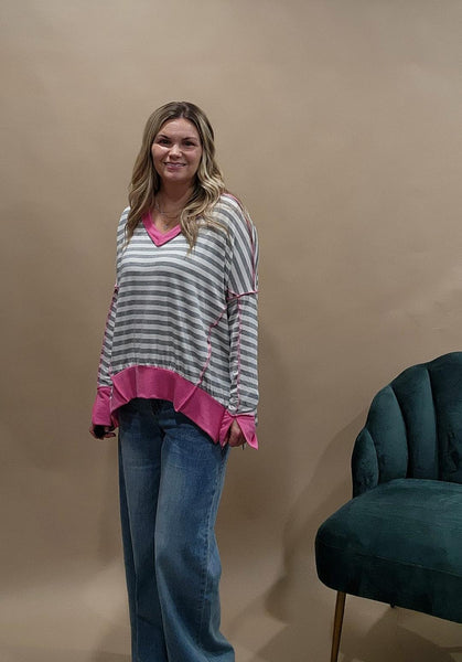 CONTRAST BAND V NECK DROP SHOULDER LOOSE FIT LONG SLEEVE WITH SLIT HI LOW YARN DYE STRIPE KNIT TOP WITH OUT SEAM OVERLOCK REVERSE STITCHES