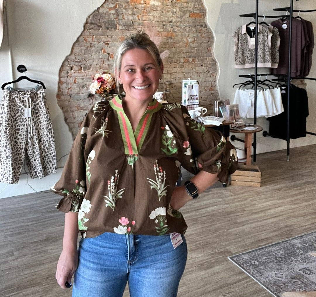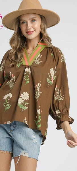 Bring a touch of nature to your wardrobe with our Meadow Bloom Blouse. This Umgee exclusive features a rich brown mix base with delicate floral prints, accented by a colorful striped neckline for a playful pop. The relaxed fit and billowy sleeves with smocked cuffs create an effortlessly chic silhouette, perfect for pairing with denim shorts or your favorite jeans. A lightweight, versatile piece that transitions beautifully from weekday outings to weekend adventures.