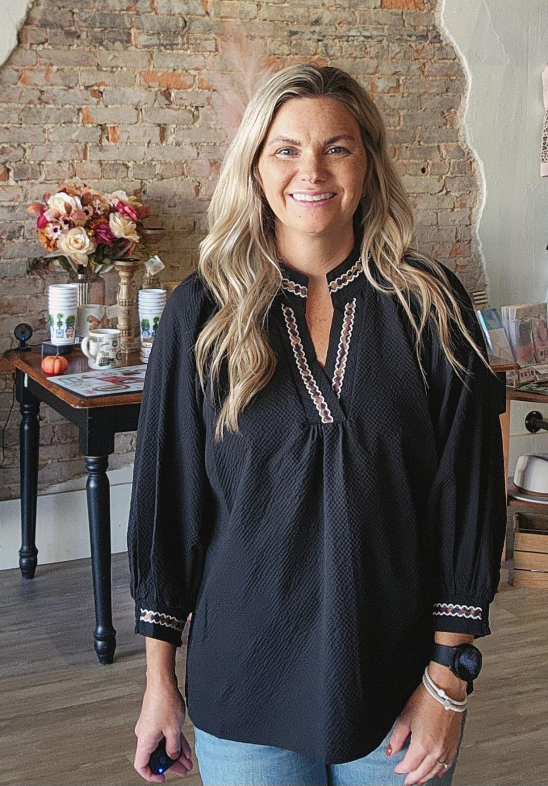 Midnight Embroidery Top ✨ Effortlessly chic, the Midnight Embroidery Blouse is your go-to for both casual and dressy days. Crafted in a soft black fabric, this top features delicate embroidered trim along the neckline and cuffs, adding just the right touch of detail. With a relaxed silhouette and flowy sleeves, it pairs beautifully with denim, skirts, or trousers—making it as versatile as it is timeless.