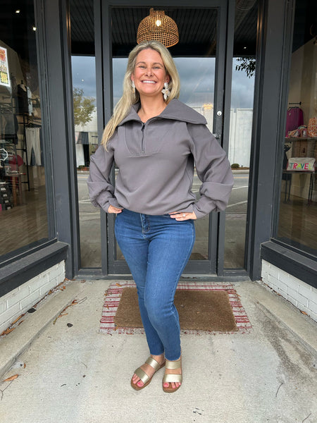Solid ribbed half-zip long sleeve top featuring oversized collar. Split at hem. Unlined. Knit. Non-sheer. Lightweight.