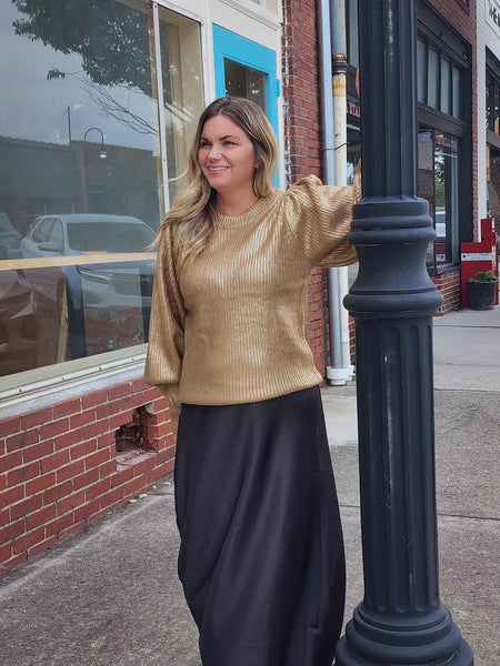 Metallic knit pullover with a U-neck, long lantern sleeves, and ribbed hems.